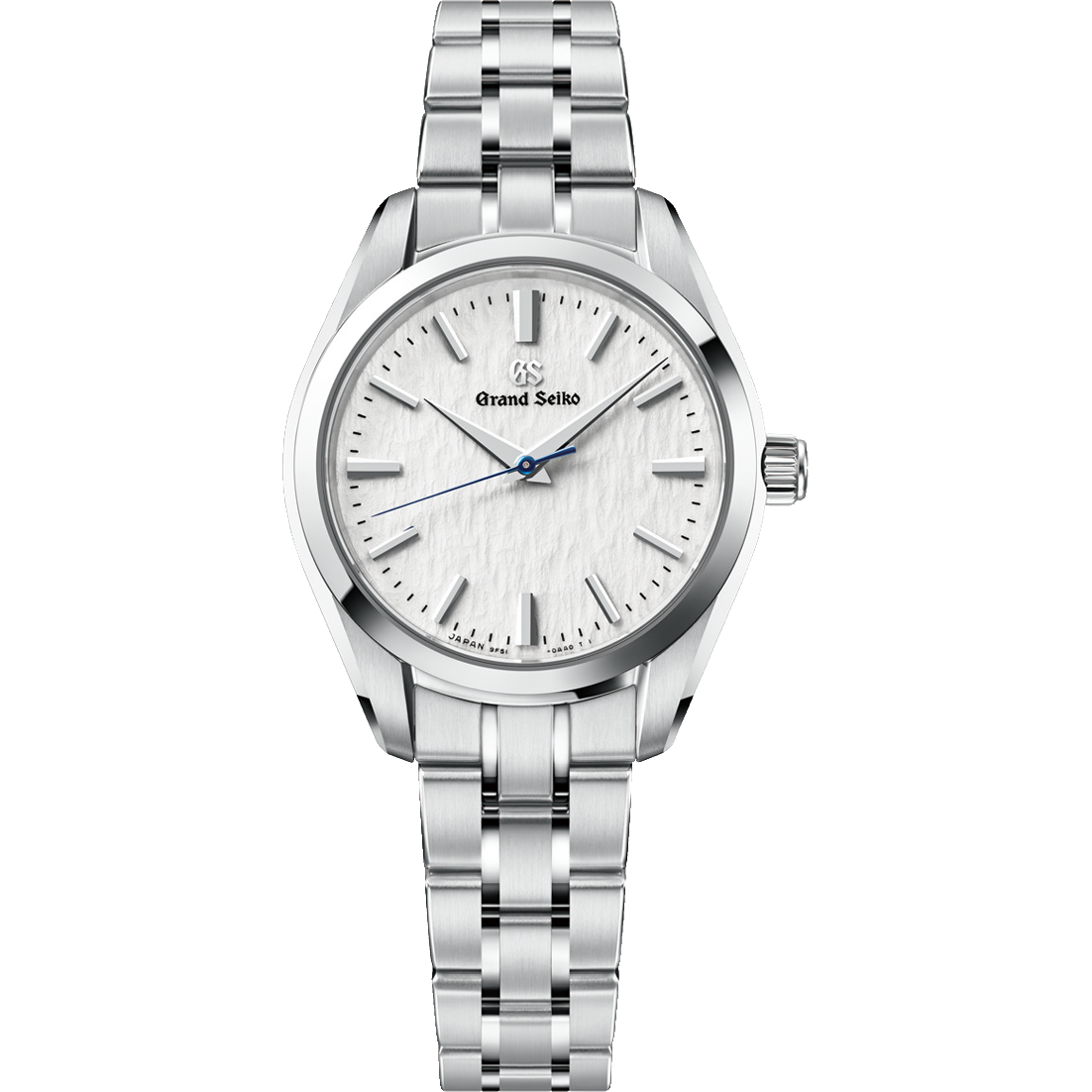 To capture the rugged texture and pure whiteness of the snow-covered Hotaka slopes, a special process combining silver-plating, clear coating, and finishing is used rather than an application of white paint. By refining the plating thickness, and using a combination of coating and finishing techniques, the dial achieves superior light reflection and brilliance, resulting in the pristine white finish that defines its beauty. Adding a striking contrast, the vivid blue of the tempered steel seconds hand shines as an elegant accent against the pure white dial.
