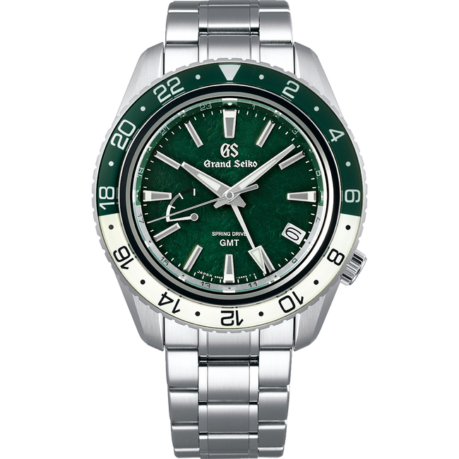 Spring Drive GMT model with a dial reminiscent of the dynamic cliffs of the Hotaka Mountains. Powerful winds and snow sculpted the faces of the cliffs over many long years to create a dynamic mountain range that is honored by this powerful sport watch. The Sport Collection Spring Drive GMT Triple Time Zone SBGE295 has a patterned dial that represents these sheer cliffs and features a green color designed to capture the brilliance of Hotaka’s short summers. The watch features the Caliber 9R66 Spring Drive movement with GMT function. Its rotating bezel with a 24-hour scale is crafted from sapphire glass and is complemented by another 24-hour dial ring display. Together, they allow the wearer to read the time in three time zones.